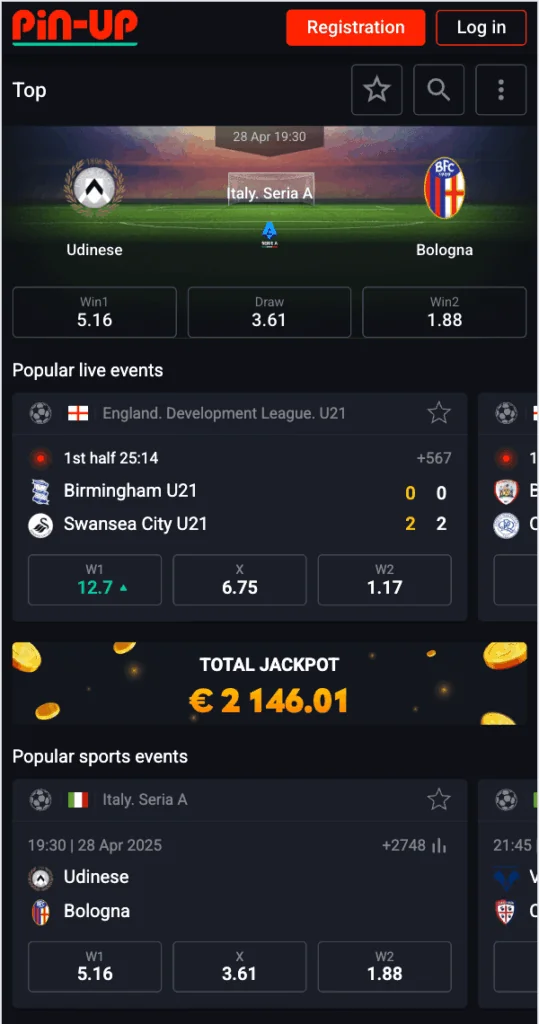 - Click “Sports” in the top navigation menu at sport bet Pin Up, which will take you to the main betting interface in pin.